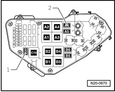 2. Fuel Pump (FP) 2 Relay (J49), (Fuel Pump -FP-, left), position A6.