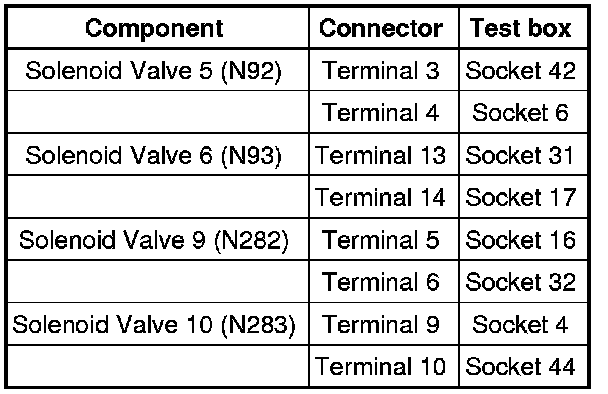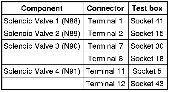 - Check resistances of solenoid valves at connector to the solenoid valves: