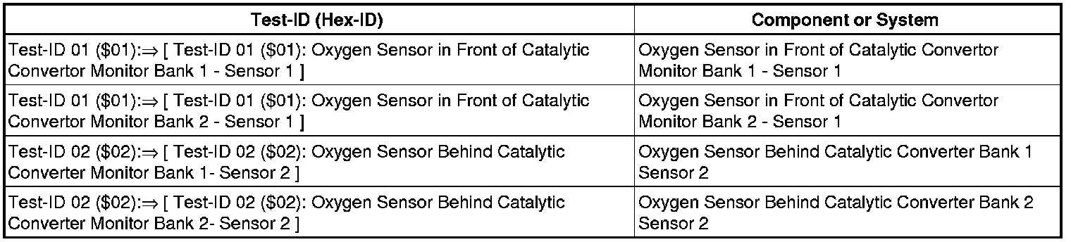 Test-ID 01 ($01): Oxygen Sensor in Front of Catalytic Convertor Monitor Bank 2 - Sensor 1