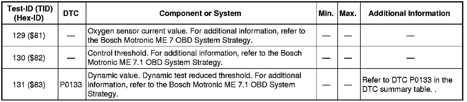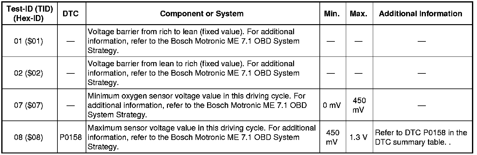Test-ID 01 ($01): Oxygen Sensor in Front of Catalytic Convertor Monitor Bank 1 - Sensor 1