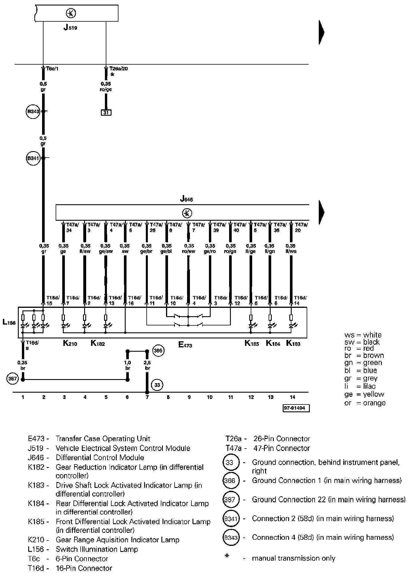 Fuse Identification: Starting with fuse 23, fuses in the fuse holder are identified with an additional numeral 2 added to the number when shown in the wiring diagram (i.e. fuse 23 in the vehicle becomes 223 in the diagrams, fuse 24 becomes 224, and so on).