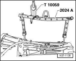 - Fasten engine sling 2024 A with shackle T10059 to shop crane VAS 6100, as shown in the illustration.