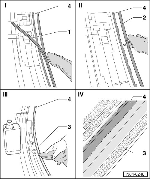 - Soak the remaining sealing lip and trail of primer - 3 - using a cloth saturated with silicone remover (LSE 020 100 A3) and wipe off.