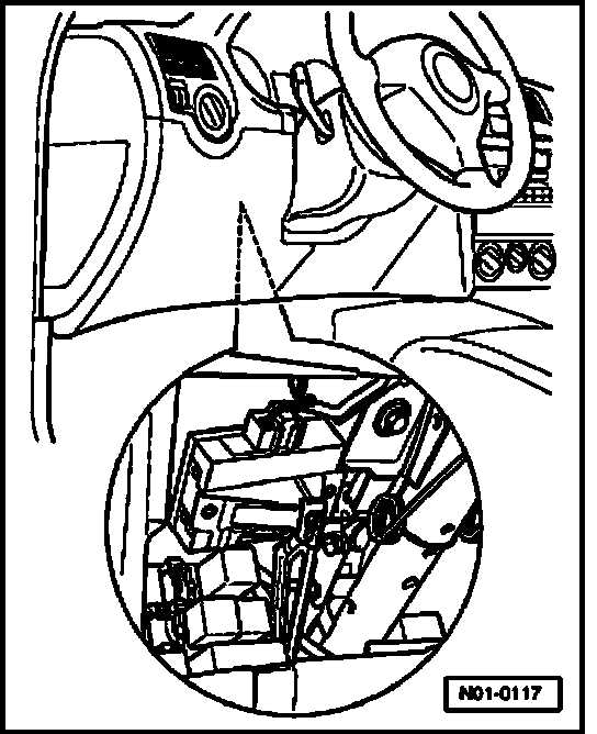 The Central Locking Control Module -J379- is located under the instrument panel and is secured by a bracket to the steering column. It is equipped with a DTC memory. The On Board Diagnostic (OBD) connection is located under the driver's knee bar to left of the steering wheel.