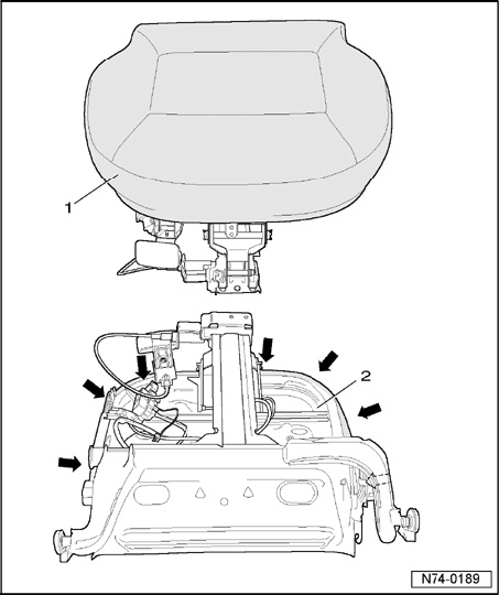 - Pull off cover - 1 - from seat frame - 2 - - arrows -.