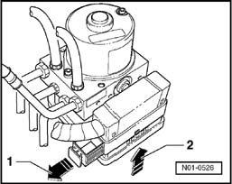 - Release ABS Control Module (w/EDL) -J104- connector -arrow 1- and pull off -arrow 2-.