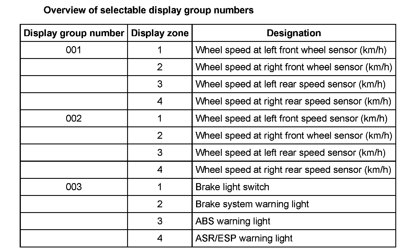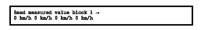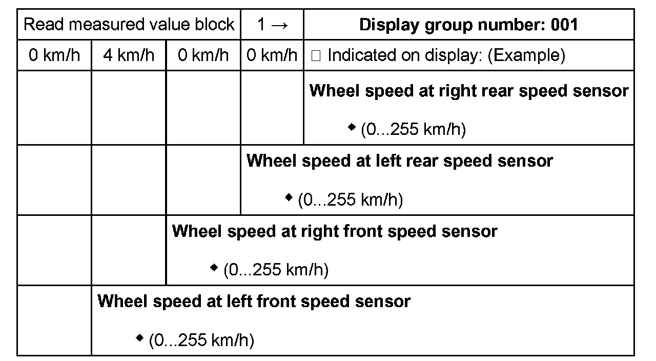 The actual wheel speeds are displayed. They serve to check the speed sensor allocation to the wheel. (The vehicle must be raised and the wheel must be rotated by hand by a 2nd mechanic).