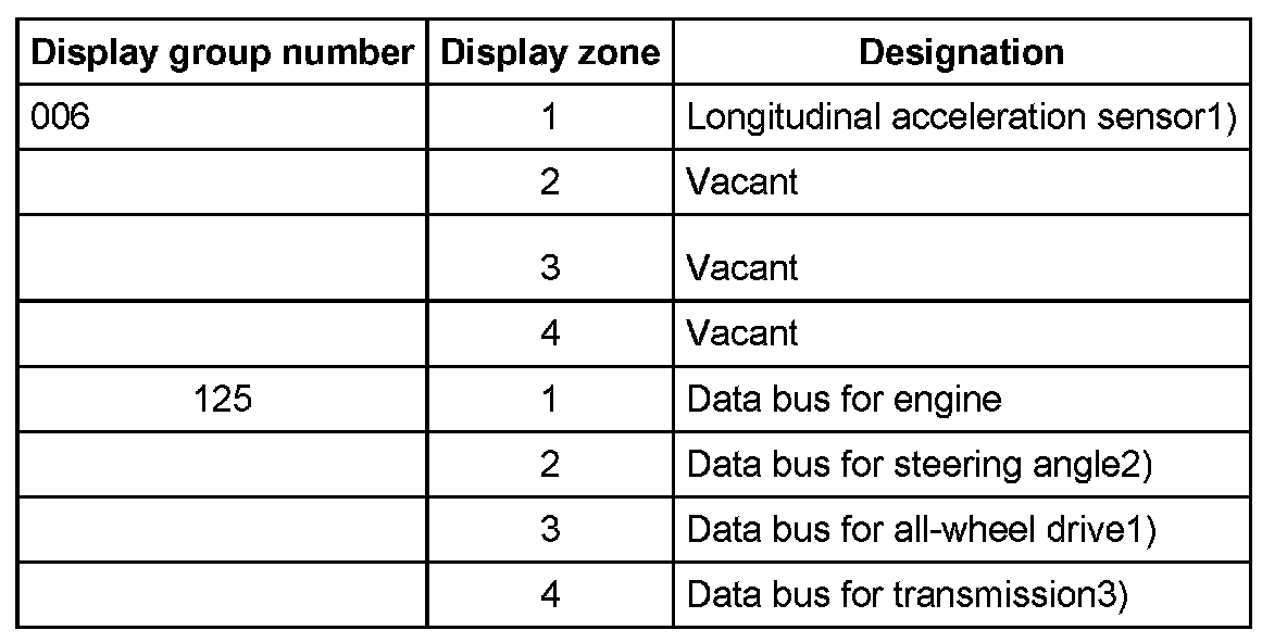 The control module can transfer a considerable amount of test data. This test data delivers information on the operational condition of the system and/or sensors connected to it. In many cases the transferred test data supports troubleshooting and repair. The test data has been summarized into single display groups because all the information cannot be evaluated at the same time. The information can be selected via display group numbers.