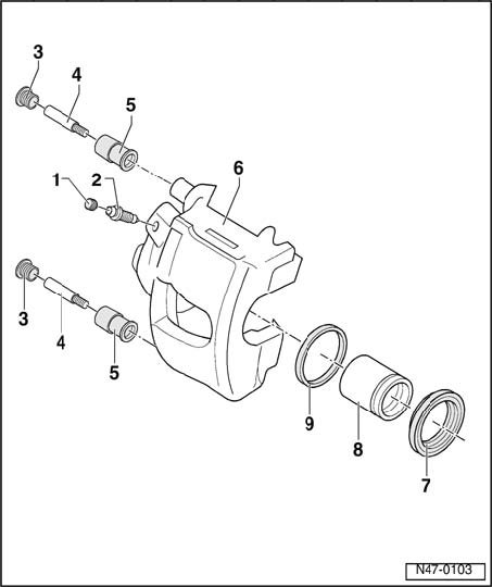 ^ Apply thin coat of lubricant G 052 150 A2 to brake cylinders, pistons and seals.
