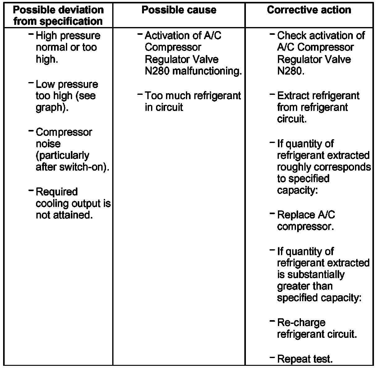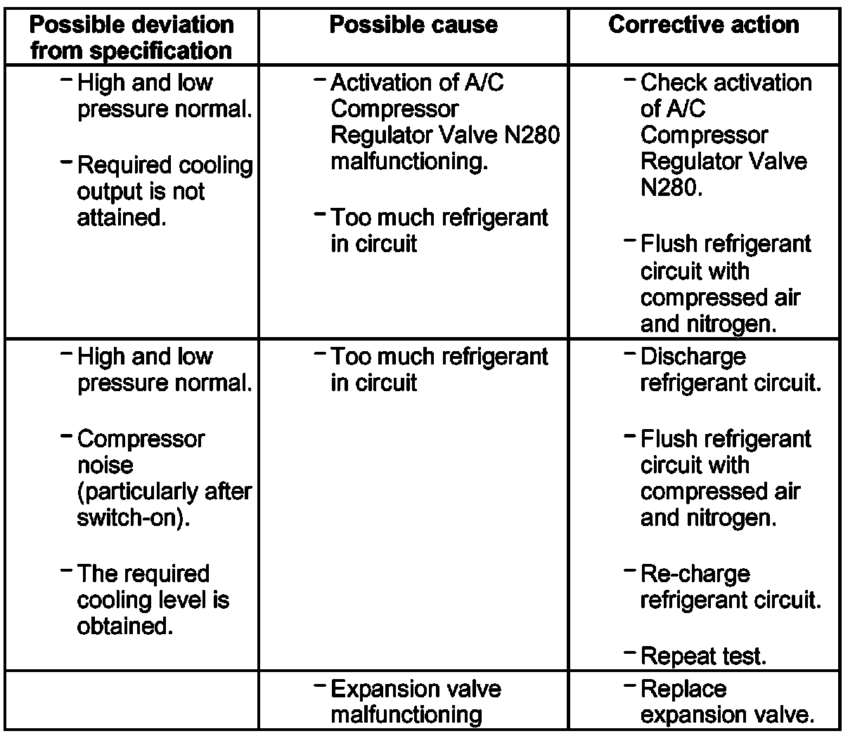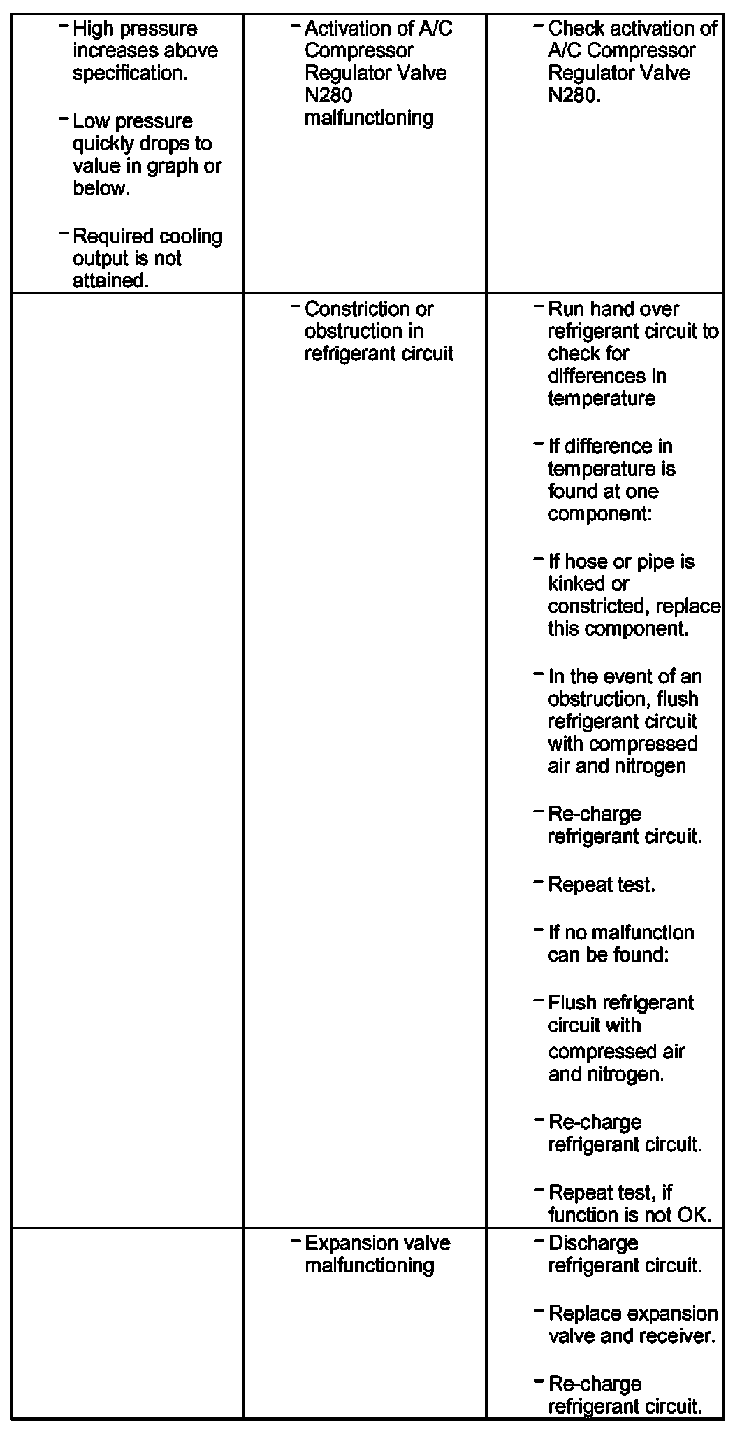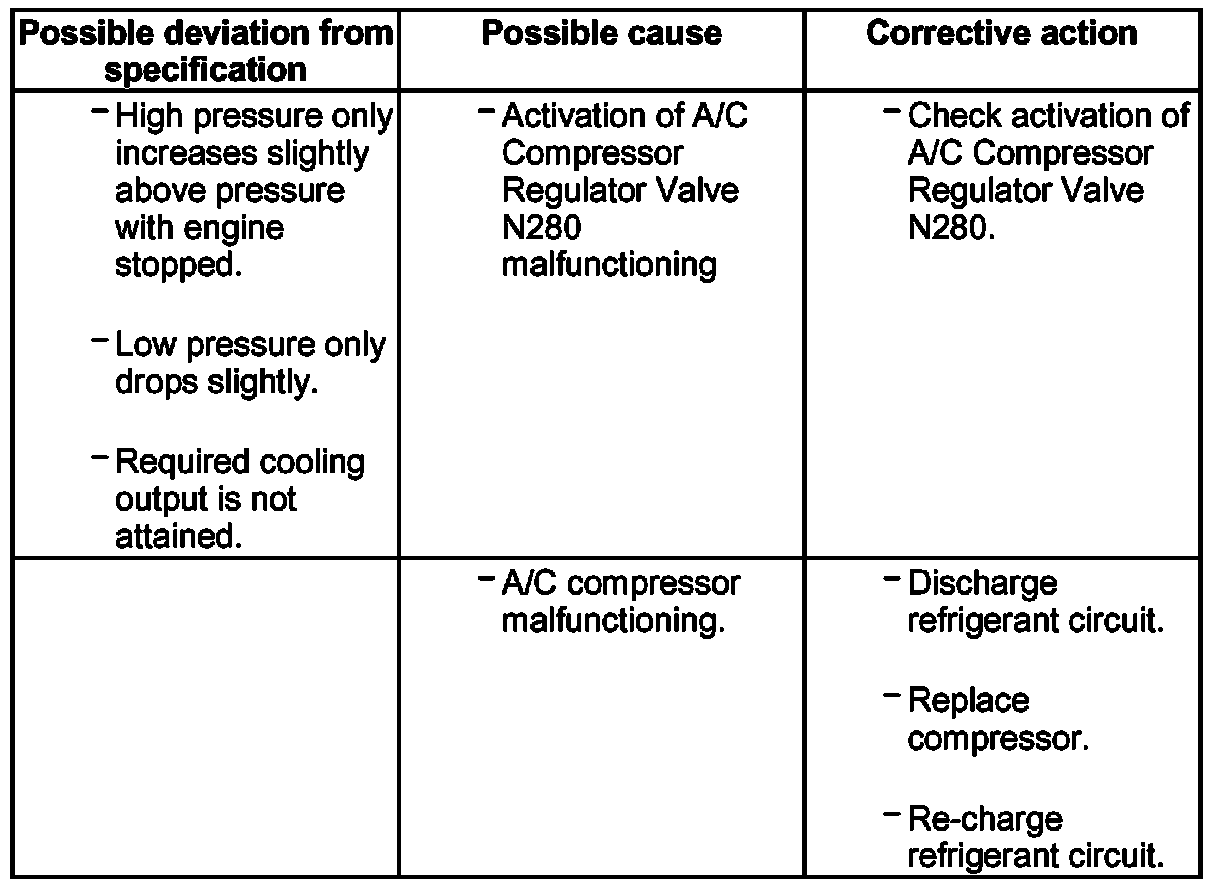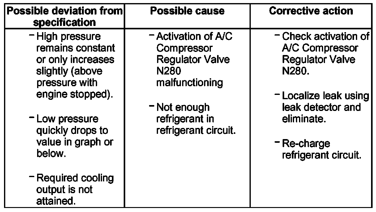 - If expansion valve is malfunctioning (permanently closed or does not open sufficiently), A/C Compressor Regulator Valve N280 is actuated to maximum output and low pressure drops to value in graph or below (compressor draws off refrigerant from low-pressure side). As however refrigerant cannot flow via expansion valve, cooling output is not attained and high pressure may also not increase or only increase slightly due to the absence of energy conversion.