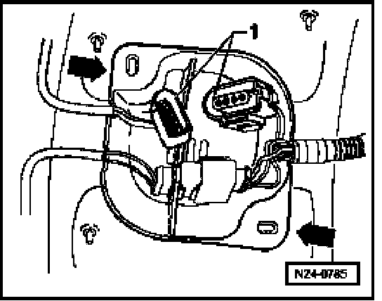 - Remove protective cover (arrows) and disconnect 4-pin harness connector (black) -1- to Oxygen Sensor (O2S) Behind Three Way Catalytic Converter (TWC) -G130-.