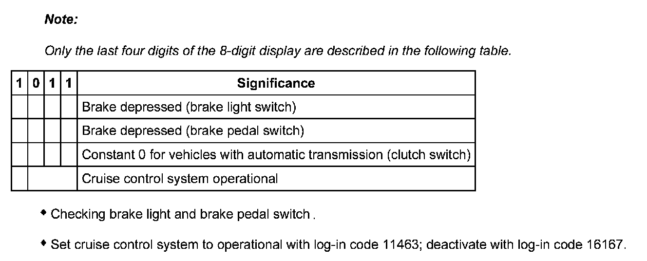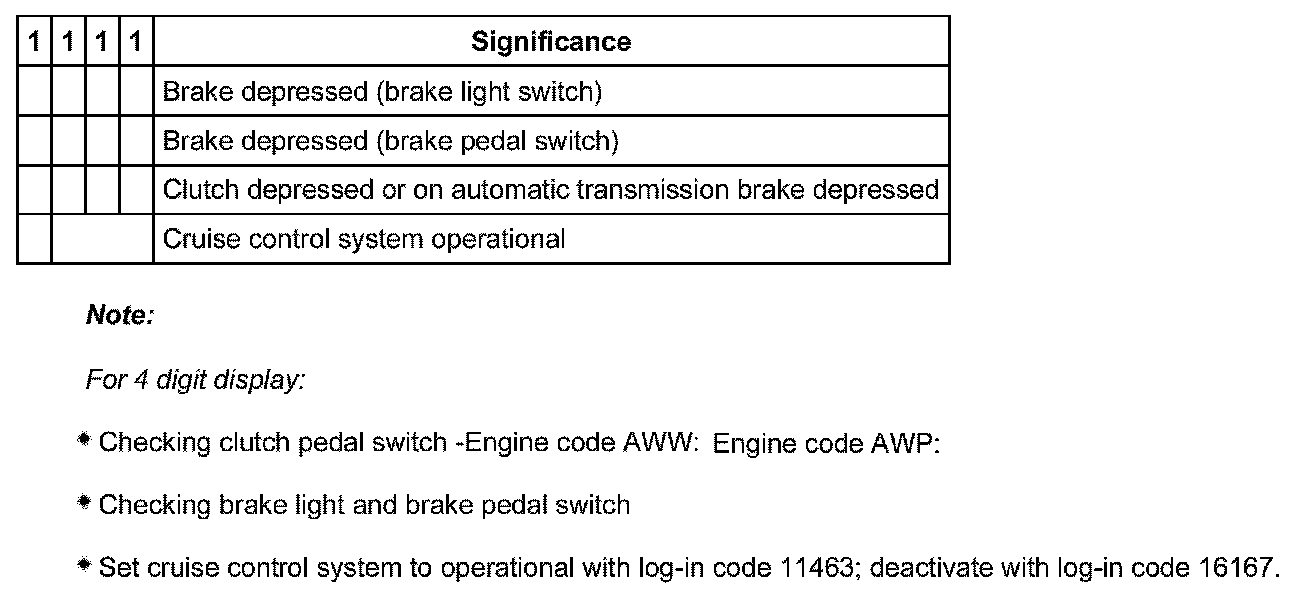 Significance of the numbers in the 8-digit display, display field 2, brake and cruise control switch