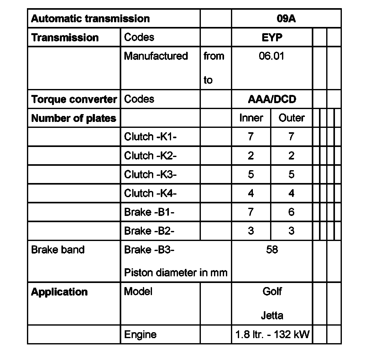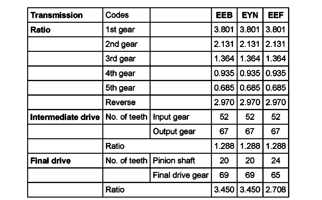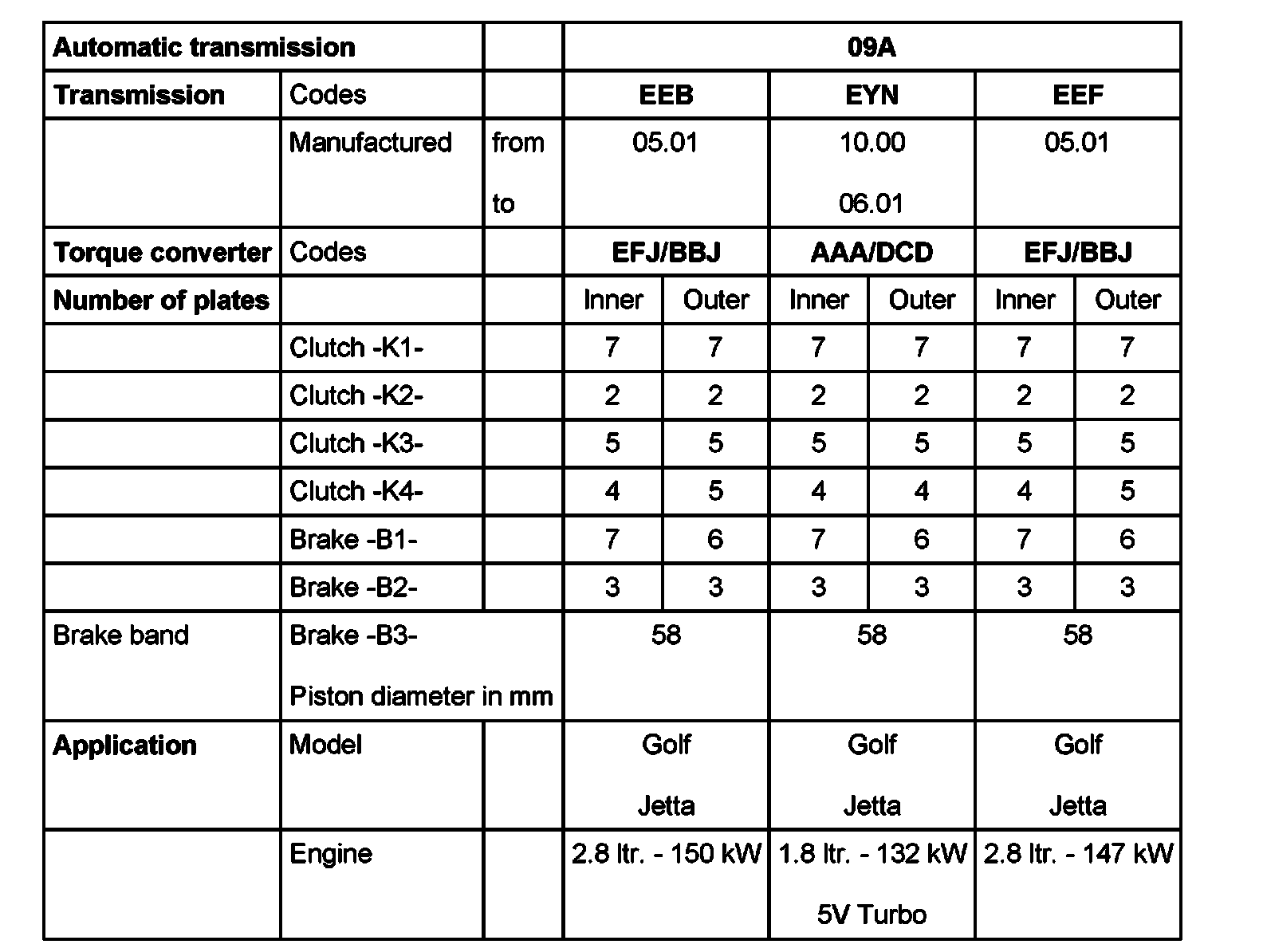 Code letters, transmission application, ratios, equipment, 09A, 5 Spd. A/T