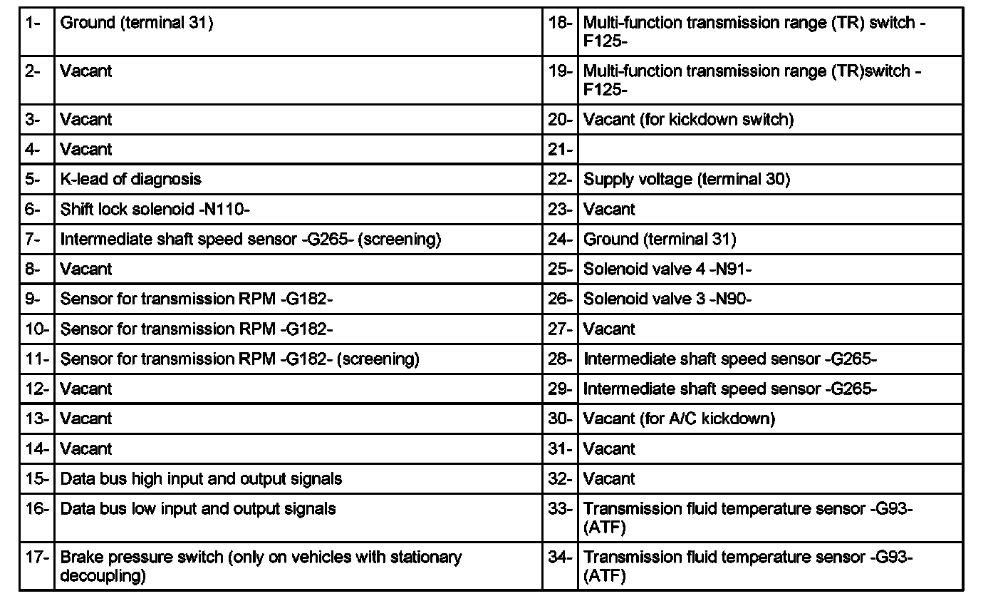 Multi-pin control module connector (68-pin connector) -J217- (sockets on VAG 1598/18), 09A, 5 Spd. A/T