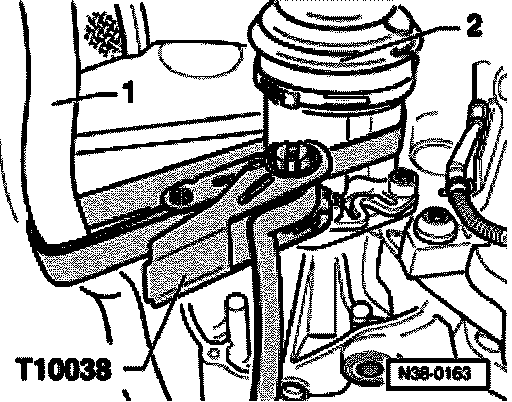 - Position tensioning strap T10038 around stabilizer bar -1- and right-hand drive shaft -2-.