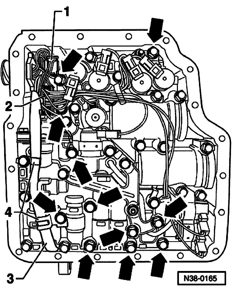 - Remove transmission sensor wiring harness -3- from retainer tabs -4- on side of valve body.