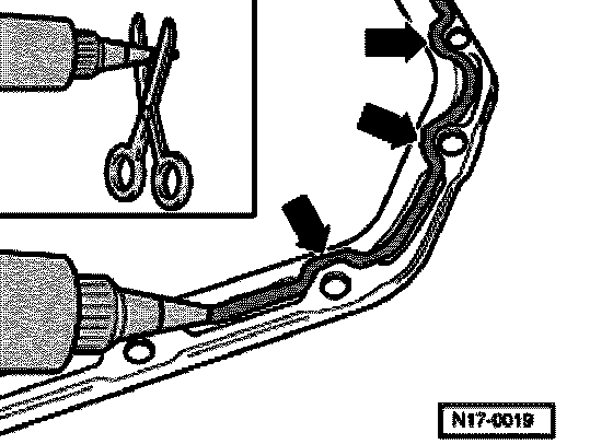 - Apply sealant as shown to cleaned sealing surface of valve body cover. Bead of sealing compound must be: