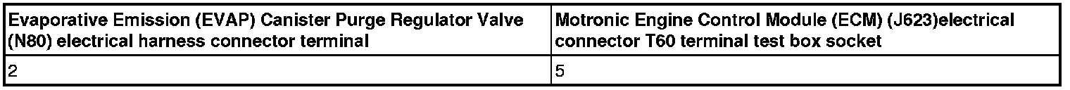 - Using a Multimeter, check the Evaporative Emission (EVAP) Canister Purge Regulator Valve (N80) electrical connector terminal 2 to Motronic Engine Control Module (ECM) (J623) electrical connector T60 terminal 5 for resistance.