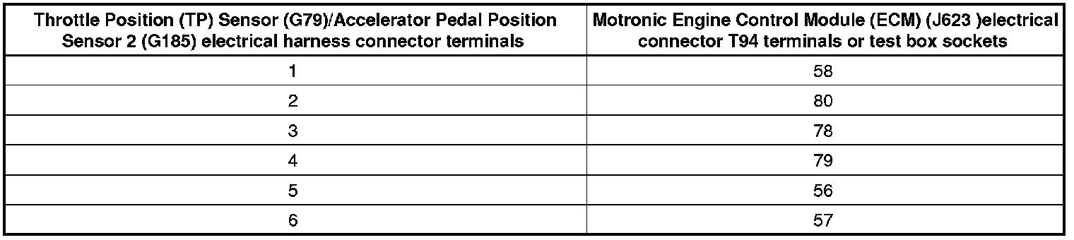 - Using a Multimeter, check the Throttle Position (TP) Sensor (G79)/Accelerator Pedal Position Sensor 2 (G185) electrical harness connector terminals to the Motronic Engine Control Module (ECM) (J623) electrical connector T94 for resistance.