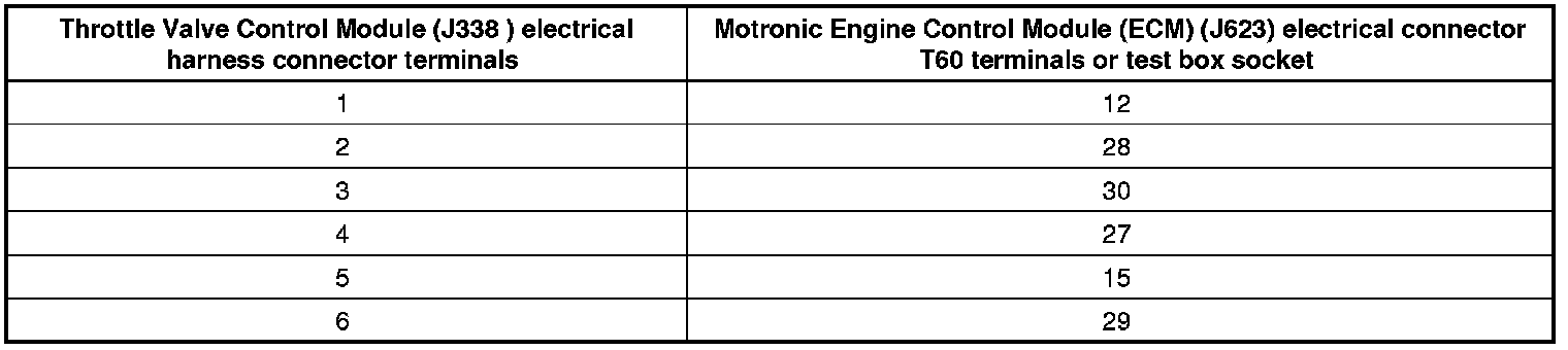- Using a Multimeter, check the Throttle Drive (for Electronic Power Control (EPC)) (G186) at Throttle Valve Control Module (J338) electrical harness connector terminals to the Motronic Engine Control Module (ECM) (J623) electrical harness connector T60 terminals for resistance.