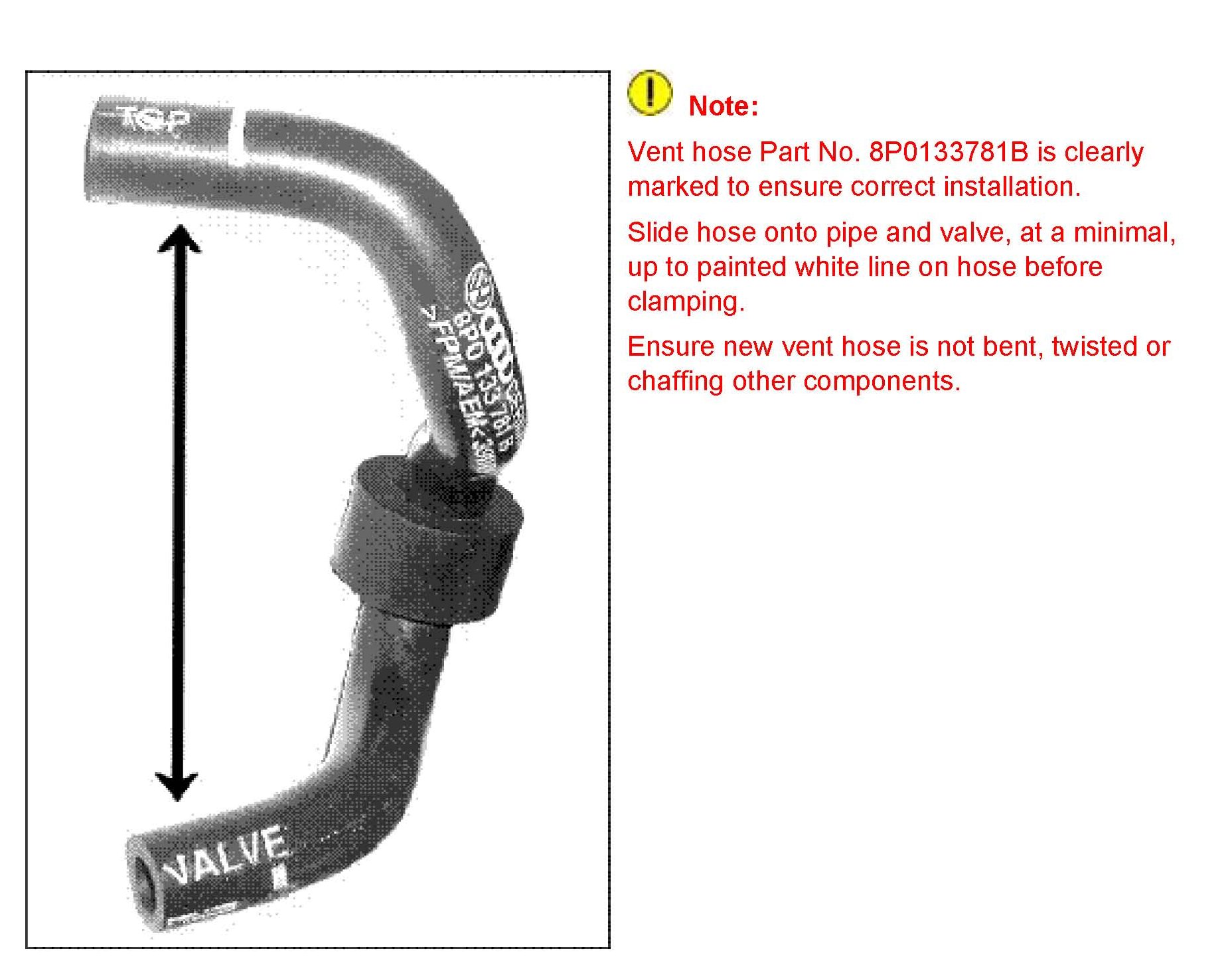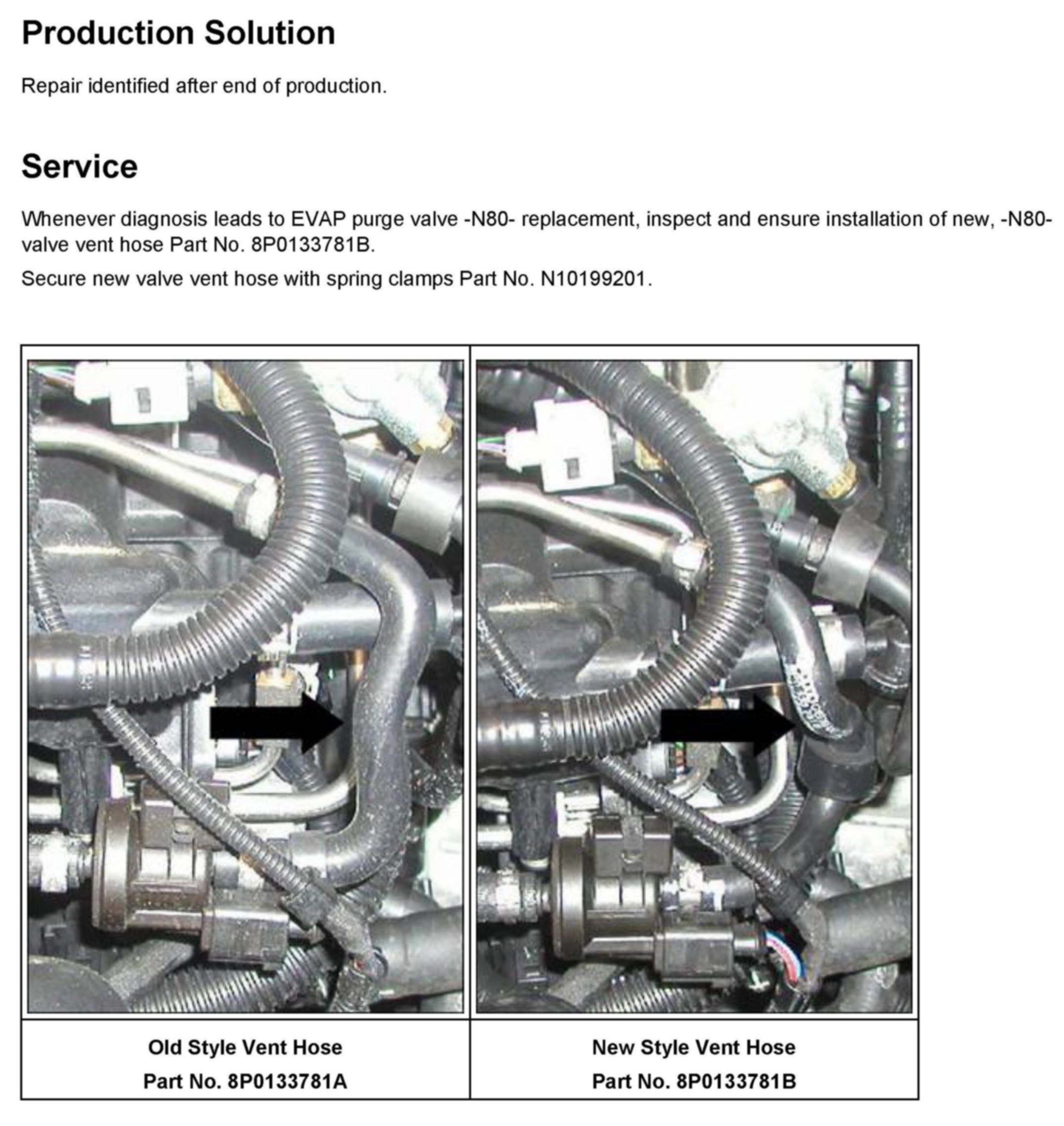 New design vent hose Part No. 8P0133781B for EVAP purge valve -N80- to improve EVAP system performance.