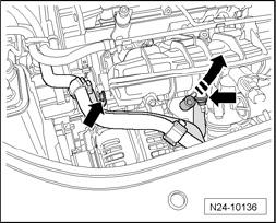 - Disconnect coolant pipe and oil dipstick guide from intake manifold -arrows- and pull off oil dipstick guide upward from engine.