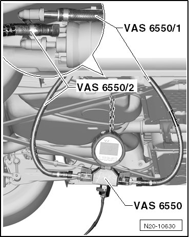- Connect the (VAS 6550) to the fuel supply line using (VAS 6550/1) and (VAS 6550/2).