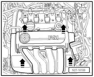 - Pull off engine cover upward - arrows -.