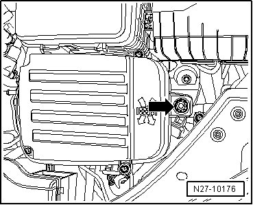 - Remove air filter housing mounting bolt - arrow -.