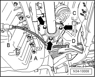 If an intermediate shaft - C - is installed, remove the right drive axle - A -. Then remove the intermediate shaft from the mounting bracket - D - - arrows - and pull it off from the stub shaft of the transmission.