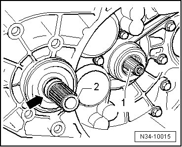 • On vehicles with a intermediate shaft, loosen the bolt - 2 - for the right drives axle - 1 - a maximum of 90° with the vehicle resting on its wheels, otherwise the wheel bearing will be damaged.