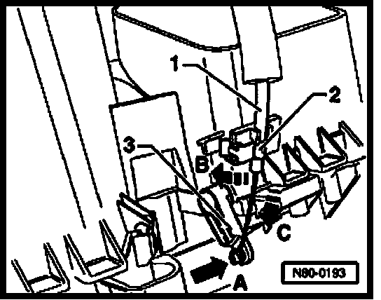- Push footwell/defroster flap lever to stop -arrow C- and attach outer cable -1- with clip -2-, -arrow B-.