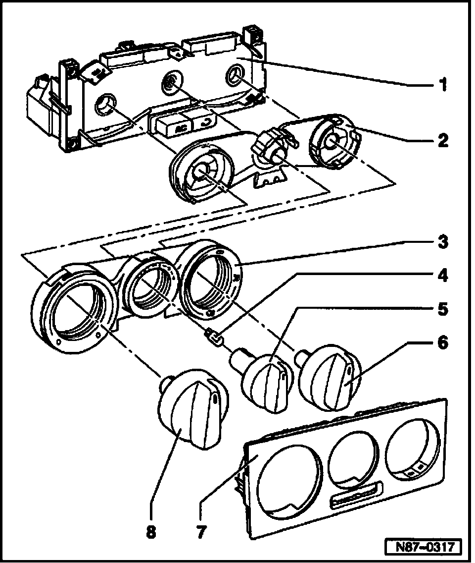 - Unclip trim panel -item 7- and rotary control -item 5-.