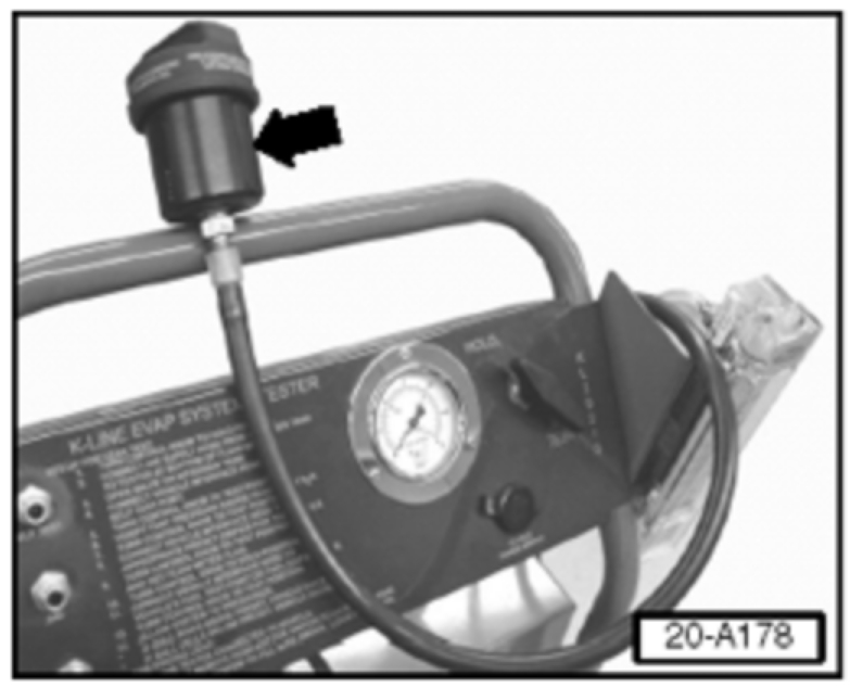 Basically, in the following procedure the EVAP system will be filled with smoke, the engine started and the LDP activated using the VAS 5051 or VAS 5052. With the LDP activated, and after clearing initial smoke away from the LDP area using compressed air, the system is then filled with smoke again and rechecked for smoke at the LDP filter.