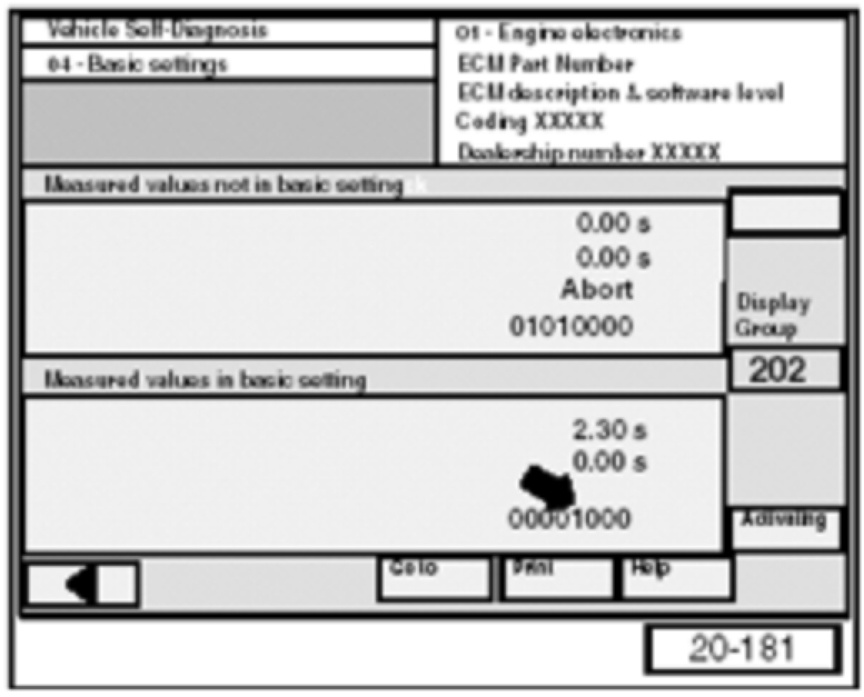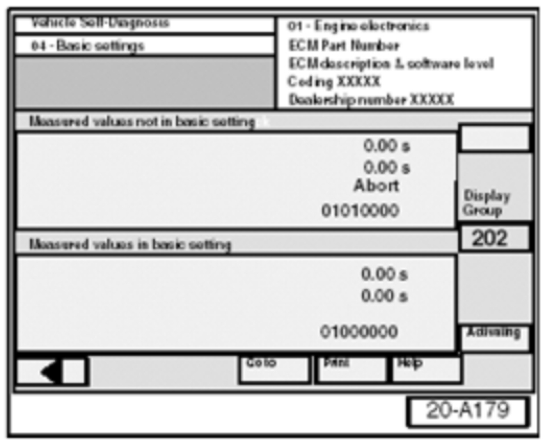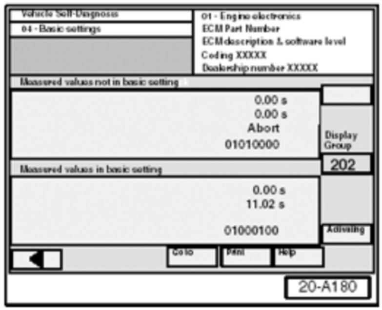 - Select vehicle system "01 - Engine electronics". Select Diagnosis Function "04 - Basic settings".