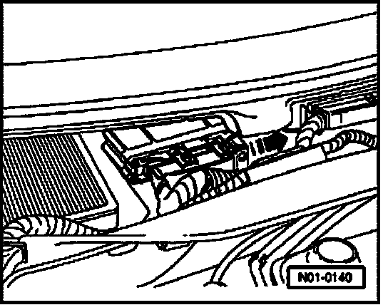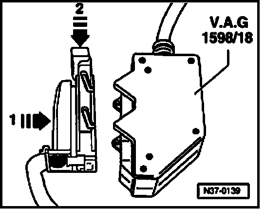 - Connect test box (V.A.G 1598/18) to control module wiring harness (arrow -1-) and engage (arrow -2-).