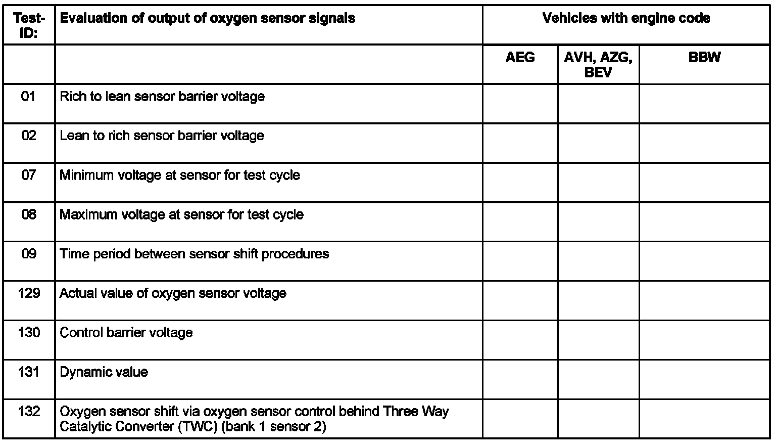 Evaluation Test-ID 132: Oxygen Sensor Shift Via Oxygen Sensor Control Behind Three Way Catalytic Converter (TWC) (bank 1 Sensor 2) (vehicles With Engine Code AVH, AZG, BEV)