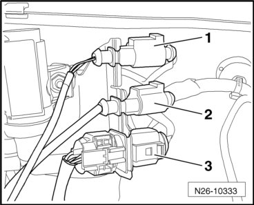 - Disconnect the connector for the Exhaust Gas Temperature (EGT) Sensor 4 (G648) - 2 - and Heated Oxygen Sensor (HO2S) (G39) - 3 -.