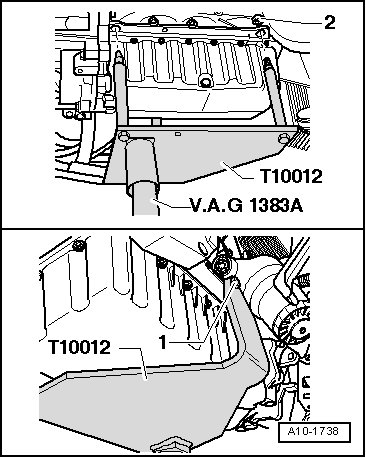- Position the (T10012) on the engine as shown and tighten the bolt - 1 - and nut - 2 -.
