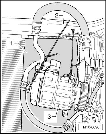 - Secure the A/C compressor - 3 - to the lock carrier - 2 - as shown. Place some cardboard - 1 - against the radiator to protect it.