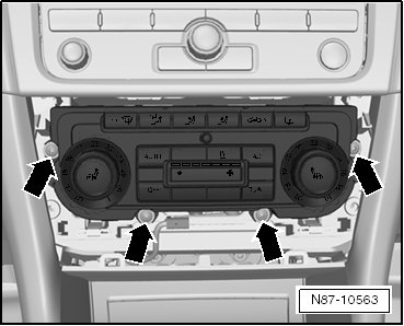 - Remove the bolts - arrows - (1.5 ± 0.2 Nm) and the Front A/C display control head.