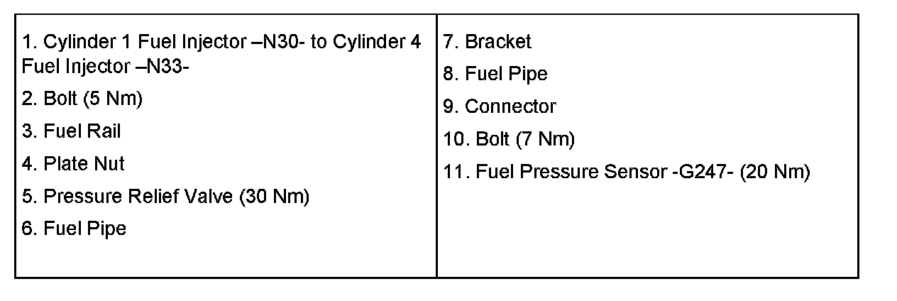 When changing a 2.0T FSI engine (BPY engine code), verify that the part number of high pressure sensor -G247- (# 11) installed on fuel rail matches part number on engine that was removed.