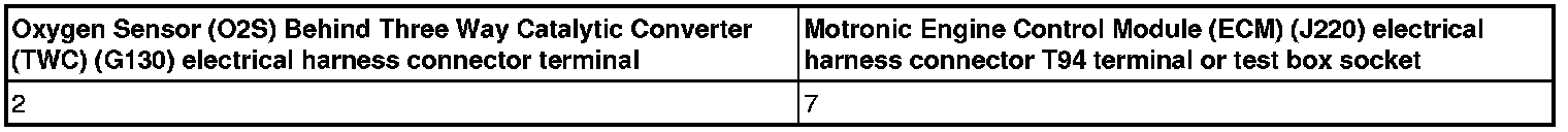 - Using a multimeter, check the Oxygen Sensor (O2S) Behind Three Way Catalytic Converter (TWC) (G130) electrical harness connector terminal 2 to the Motronic Engine Control Module (ECM) (J220) electrical harness connector T94 terminal 7 for an open circuit.