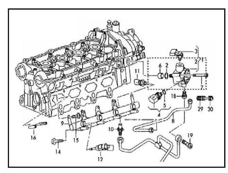 If the high pressure fuel pump camshaft lobe shows excessive wear, replace the intake camshaft with Part No. 06F109101B and the cam follower with Part No. 06D109309C, see Group 15 Engine - Cylinder head, Valvetrain in ElsaWeb.