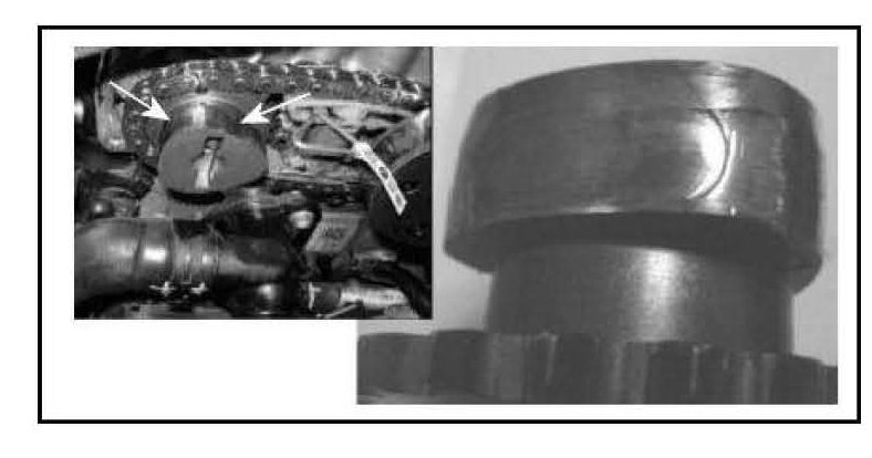 The wear on the camshaft lobe can also lead to wear on the base of the high pressure fuel pump cam follower.