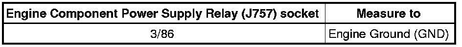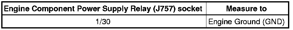 - Check the Engine Component Power Supply Relay (J757) socket 1/30 to the Battery (A) for an open circuit or short to Ground (GND).