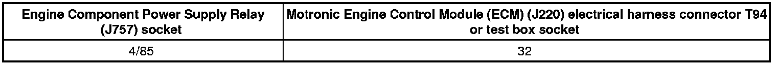 - Check the Engine Component Power Supply Relay (J757) socket 4/85 to the Motronic Engine Control Module (ECM) (J220) electrical harness connector T94 terminal 32 for an open circuit or a short to Battery (+).