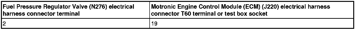 - Using a multimeter, check the Fuel Pressure Regulator Valve (N276) electrical harness connector terminal to the Motronic Engine Control Module (ECM) (J220) electrical harness connector T60 terminal for an open circuit.