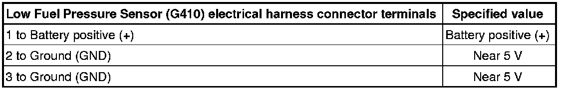 - Using a multimeter, check the Low Fuel Pressure Sensor (G410) electrical harness connector for voltage.