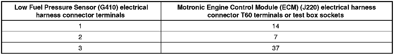 - Using a Multimeter, check the Low Fuel Pressure Sensor (G410) electrical harness connector terminals to the Motronic Engine Control Module (ECM) (J220) electrical harness connector T60 terminals for an open circuit according to the wiring diagram.
